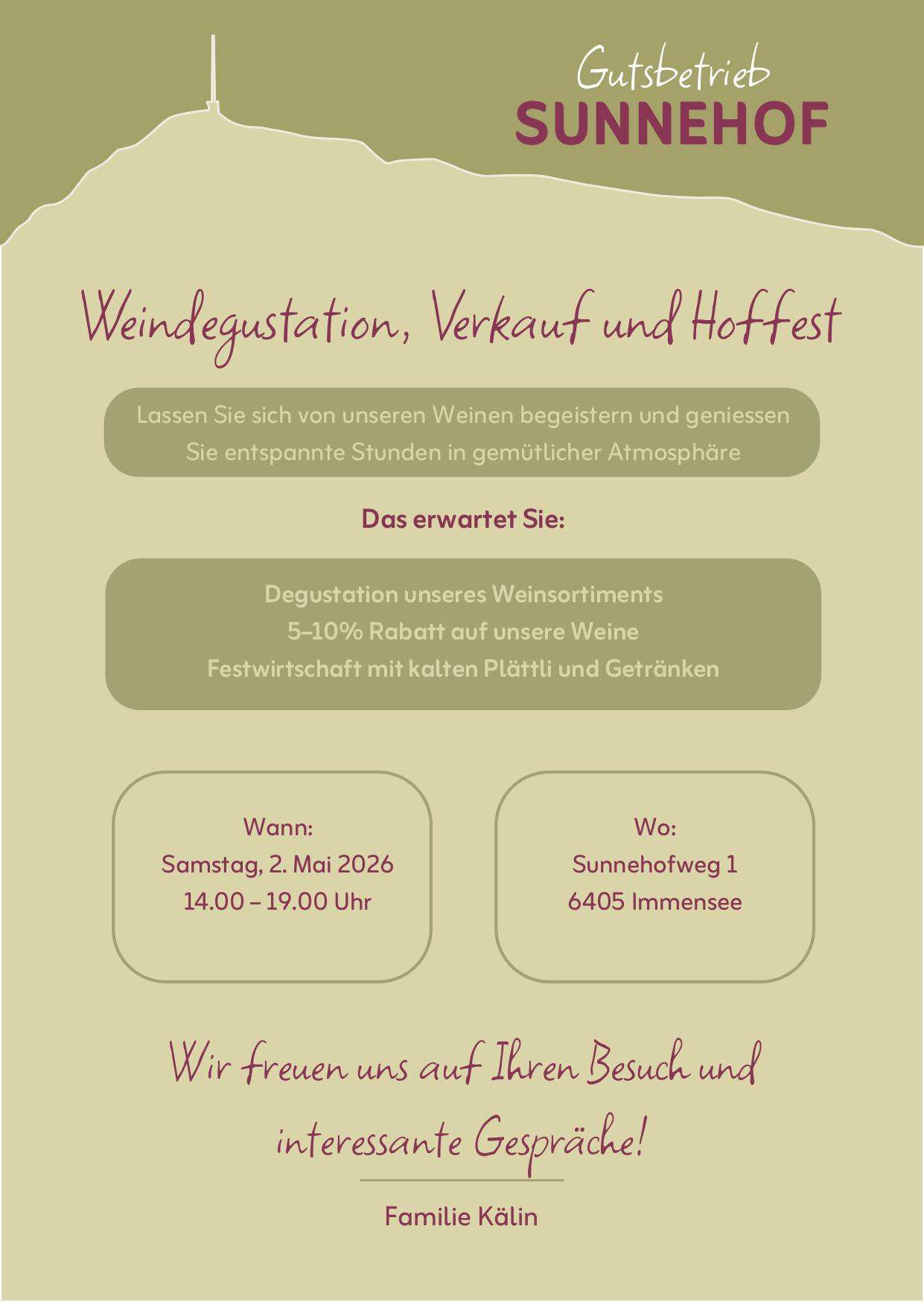 Der Gutsbetrieb Sunnehof gehört dem Bezirk Küssnacht und umfasst 26 Hektar landwirtschaftliche Nutzfläche. Seit Januar 2025 bewirtschaften wir, die Familie Kälin, den Betrieb als Pächterfamilie. Mit viel Engagement und Herzblut setzen wir uns für eine nachhaltige und zukunftsgerichtete Landwirtschaft ein und freuen uns, den Sunnehof mit Leben zu füllen.